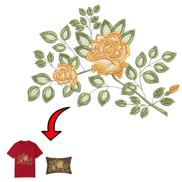 Yellow flowers with leaves Embroidery Design is available in 2 tailles, largeur / hauteur: 134×178 mm and 153×203 MM. You can download the yellow Flowers with leaves design files instantly.