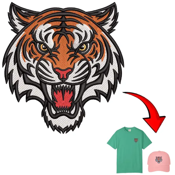 Angry Tiger Face Embroidery Design is available in 3 sizes, width/height: 58X63 mm, 69X75 mm and 94X101 mm. You can download the Angry Tiger Face design files instantly.